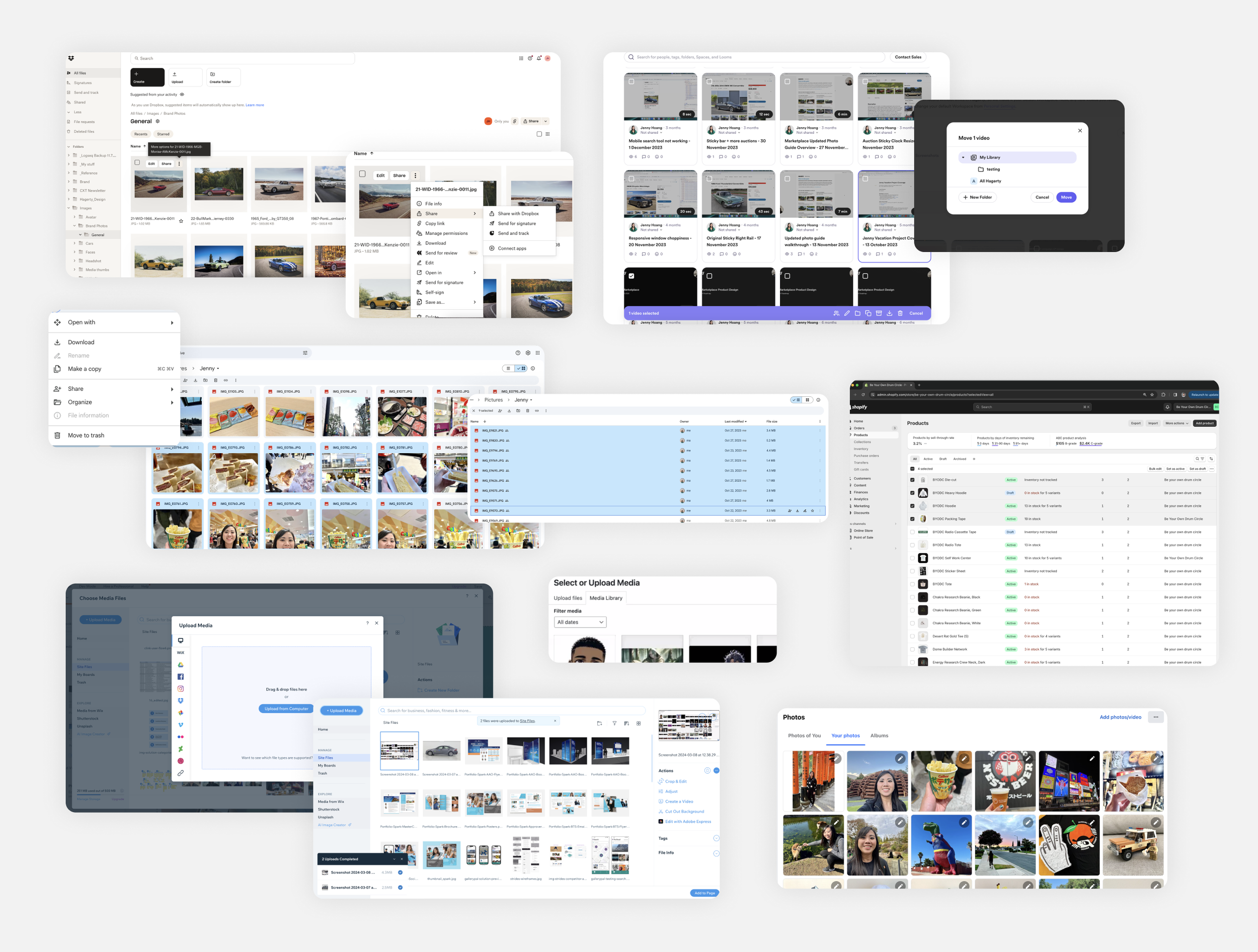 Before exploring solutions, I audited established file management tools/features including Dropbox, Google Drive, Loom, Shopify, and WordPress to identify common UX patterns. Four patterns stood out as essential to carry forward: