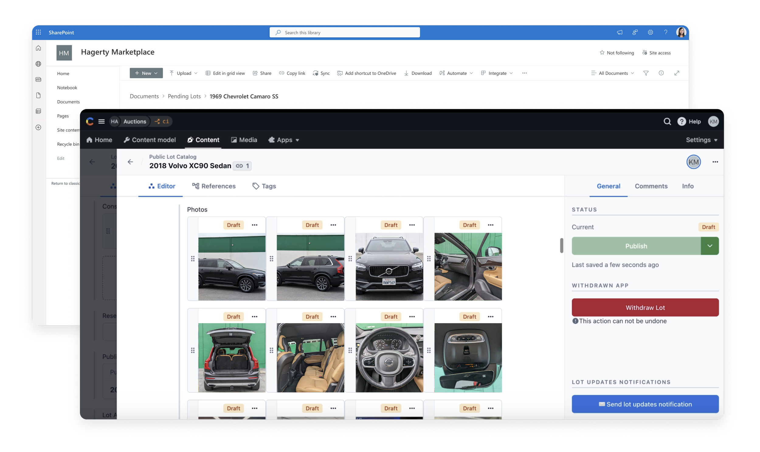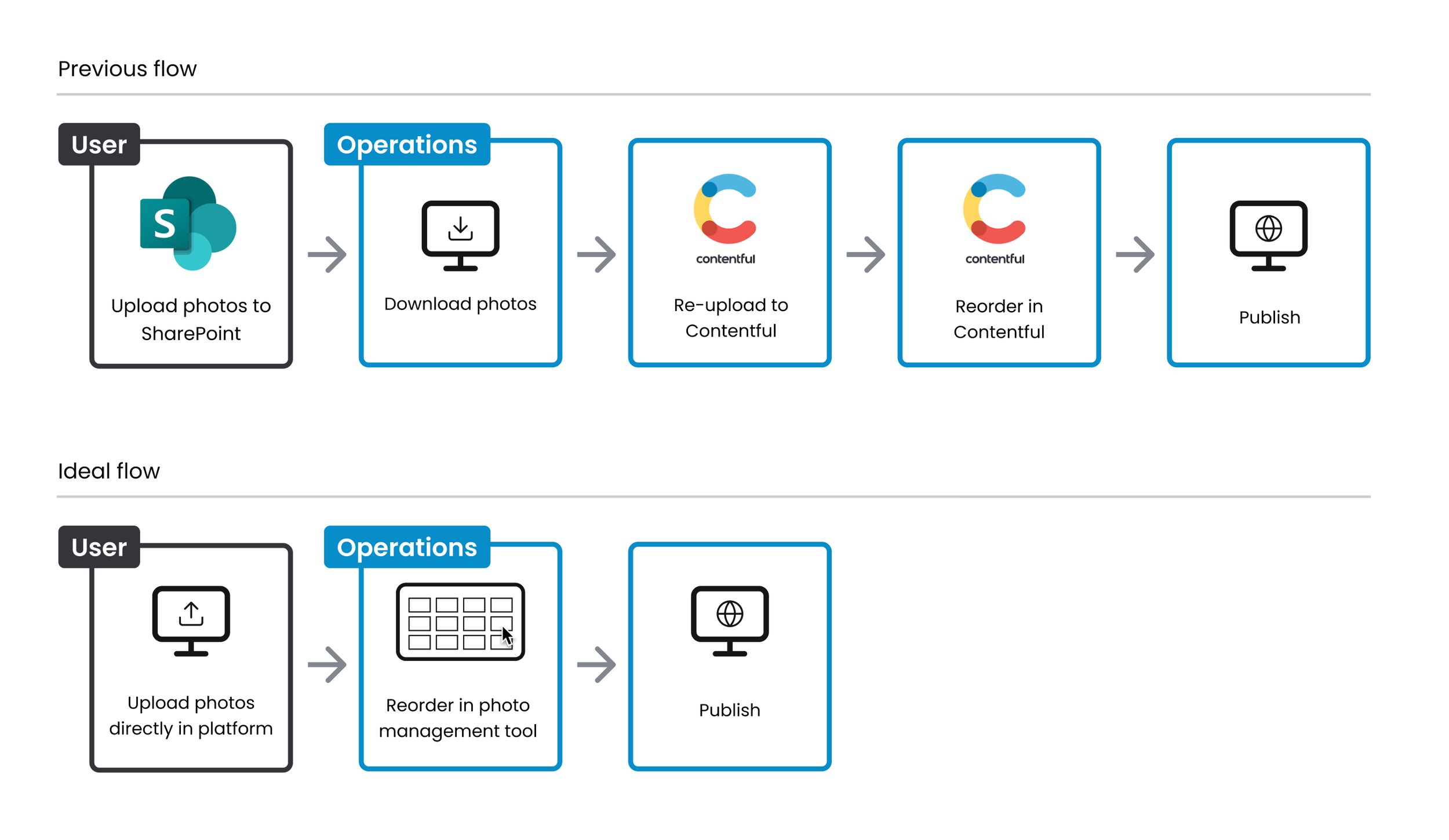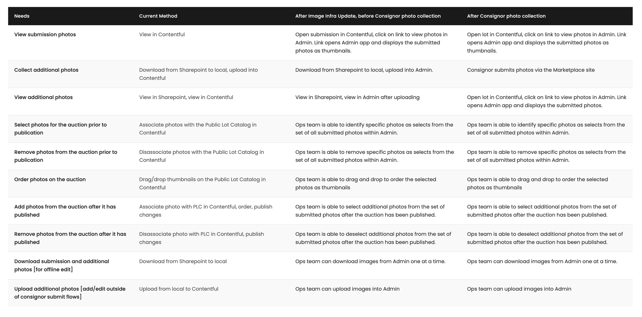 User problem: Photo management was split across two tools not designed for this use-case: Sharepoint for consignor submissions, and Contentful for internal processing, which caused friction at each step of the process.