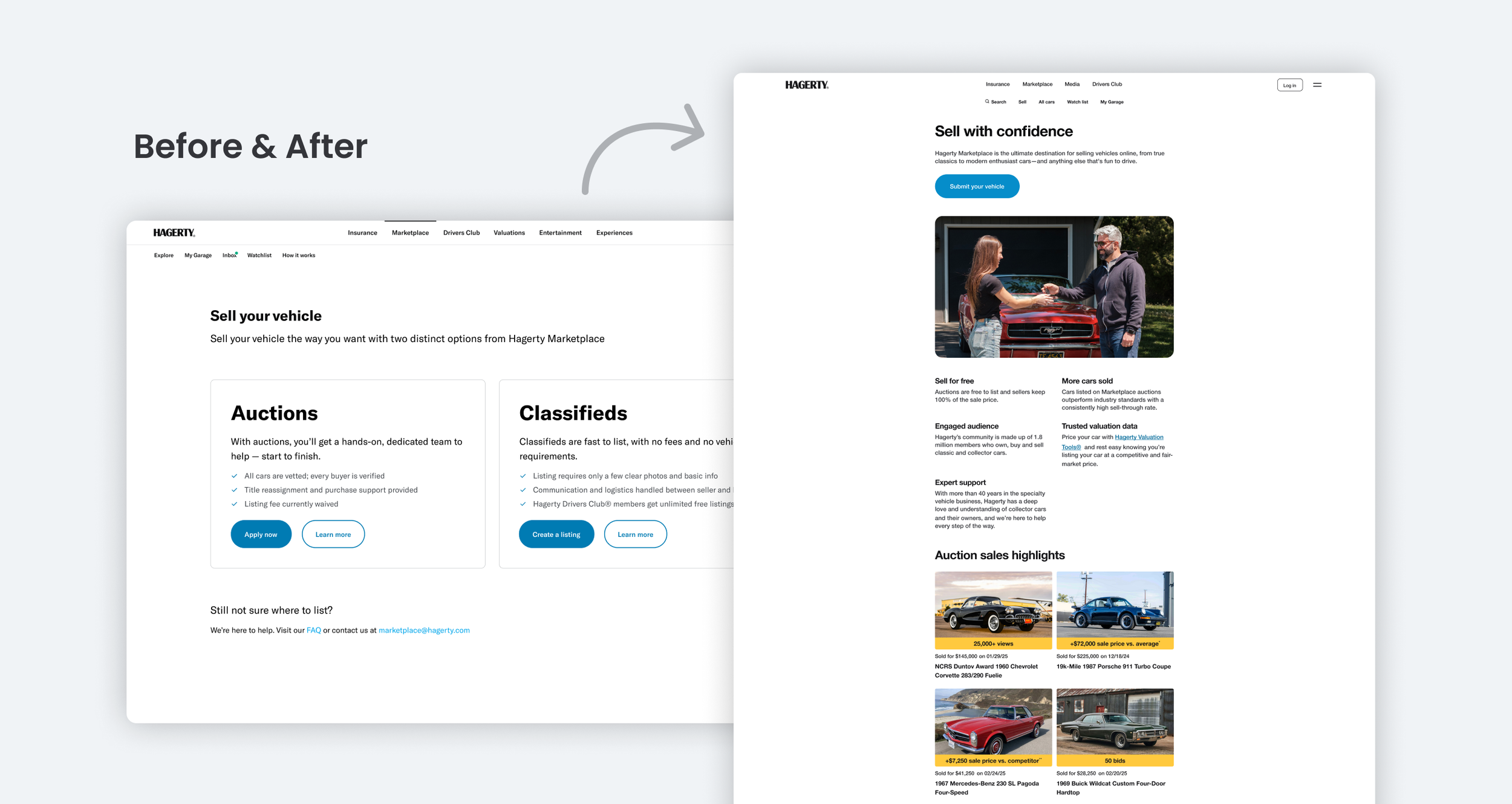 To showcase the visibility and revenue potential sellers could gain if selling with Hagerty, we show past auctions with exceptional prices and high engagement stats. This was also is a visual way to show the quality of vehicles we sell on the platform.